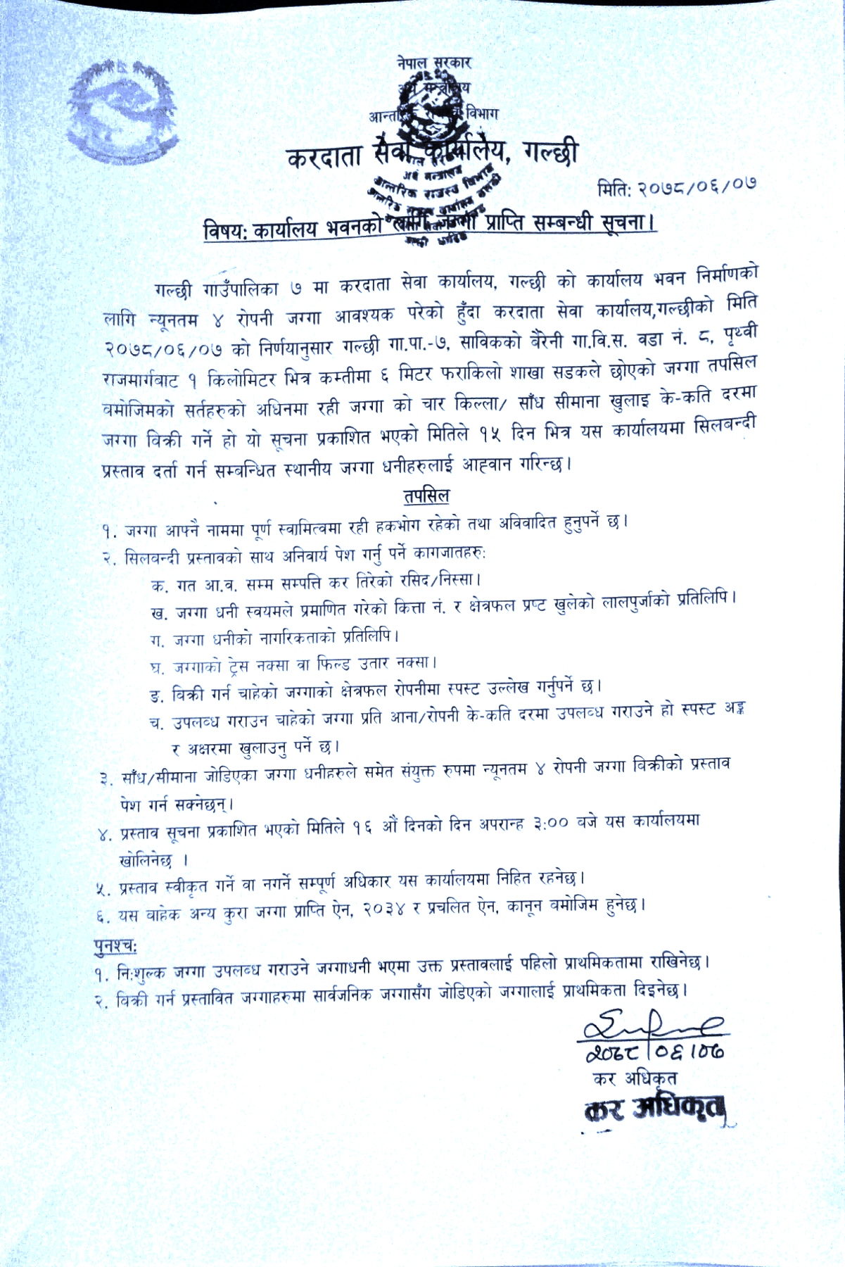 करदाता सेवा कार्यालय गल्छीको लागि जग्गा प्राप्ति सम्बन्धि सूचना