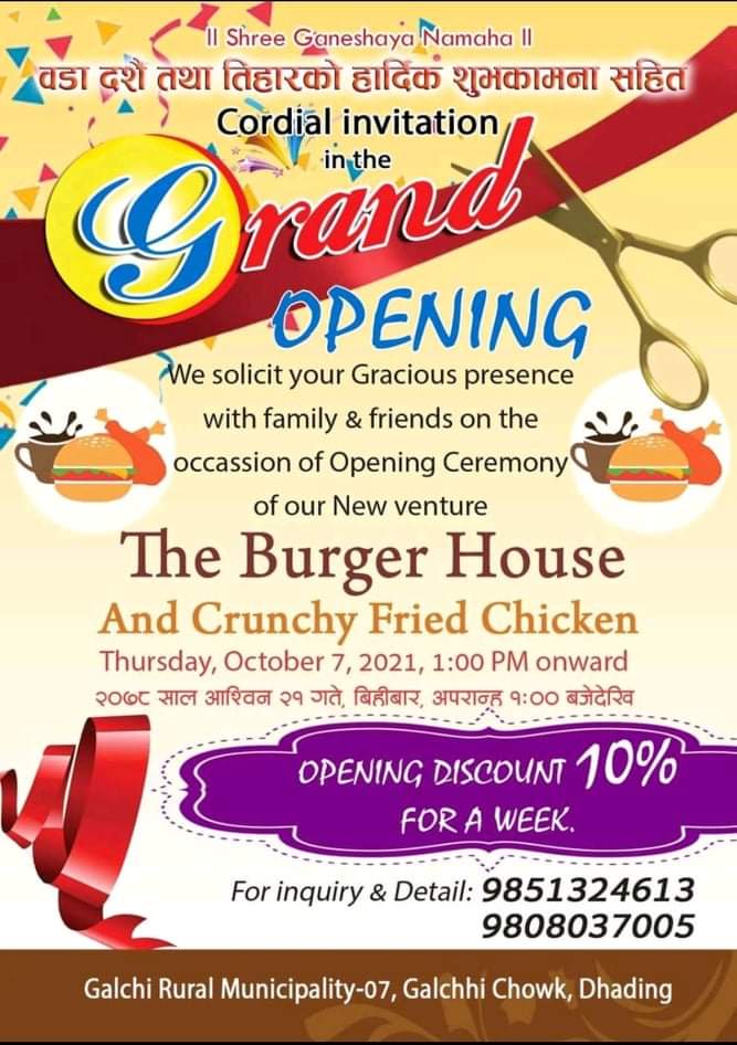 डिजिटल न्युज7 गल्छी असोज १८। धादिङ जिल्ला गल्छीगाँउपालिका वडा नं ७ मा रहेको गल्छी चोकमा करिब असी लाख लगानी छ जना युवाहरु मिलि द वर्गर हाउस एण्ड क्रन्चि फ्राई चिकेनको सन्चालनमा आएको छ भने औपचारिक रुपमा यहि मिति २०७८ साल असोज २१ गते बिहिबार देखि सन्चालनमा आउने सन्चालक दिपक खतिवडाले बताउनुभएको छ। उक्त बर्गर हाउसमा आठ जना मजदुरहरु कार्यरत रहेको सन्चालकले वताउनु भएको छ। उदघाटन को एक हप्तासम्म सम्म १० प्रतिशत छुट समेत रहेको छ। विशेष पृथ्वी राजमार्गमा आवत जावत गर्ने तथा नुवाकोटका ग्राहकहरुलाई लक्षित गरी सन्चालन गरिएको सन्चालकले बताउनुभएको छ।