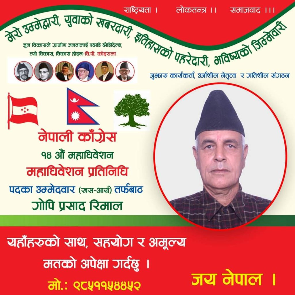 साकार पोष्ट मंसिर ७ गल्छी धादिङ। नेपाली कांग्रेसको १४ औ महाधिवेशन अन्तर्गत धादिङ जिल्लाको प्रदेश १(क) को मतगणनामा रामनाथ अधिकारी समुहको राज कुमार कुबर समुह अधिकान्स प्रतिनिधिमा विजयी भएको । हेनुहोस मतपरिणाम…धादिङ प्रदेश-१(क) को मतगणना सम्पन्न राजकुमार कुँवर बिजयीसभापतीराजकुमार कुवर-२३०श्याम रेग्मी-२१९उप-सभापतिराजु वाग्ले-२५६बिनोद लामा-१८०बिष्णु प्रशाद रेग्मी-१८७सुजन पाण्डे-२३९सचिवआत्मराम अकौलिया-२५०गोकर्ण अर्याल-२७६प्रमिला धिताल-१८३राम कुमार खत्री-१५९सह-सचिवजगन्नाथ आचार्य-२६०रबि थापा-१९३शिव प्रशाद बजगाई-१४९सन्दिप बिडारी-२५५क्षेत्रीय कार्यसमिति सदस्य (महिला) नारायणी तिमल्सिना-२३६सुनिता बिष्ट-१९७क्षेत्रीय कार्यसमिति सदस्य (खुल्ला) माधव प्रशाद खतिवडा-२१३मुरारी प्रशाद शर्मा खकुरेल-२३६राम कृष्ण थापा-२२९लक्षमण गजुरेल-१७०
