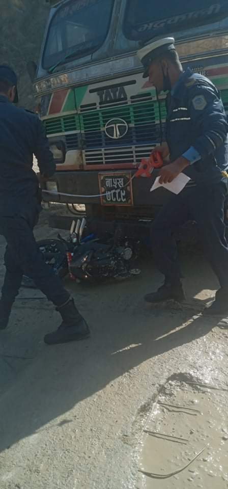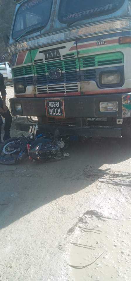 साकार पोष्ट मंसिर २८ गल्छी। सोमबार गल्छी देबिघाट त्रिशुली सडक खण्डको गल्छीगाँउपालिका वडा नं ८ मा कोल्पुखोलाको पुल नजिक ना.५ ख ७८८९ नम्बरको ट्रकले बागमती प्रदेश ०२–०२२ प ४१५१ नम्बरको मोटरसाइकललाई ठक्कर दिँदा मोटरसाइकलमा सवार गोरखा नगरपालिका–५ बस्ने ४६ वर्षीय दुर्गा बहादुर थापाको उपचारको लागि काठमाडौं लगिदै गर्दा मृत्यु भएको छ अर्को एक जना घाइतेको उपचार भइरहेको प्रहरीले जनाएको छ ।