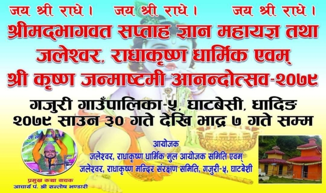 साकार पोष्ट साउन २९ गजुरी। जलेश्वर, राधाकृष्ण धार्मिक मुल आयोजक समिति एवम् जलेश्वर, राधाकृष्ण मन्दिर संरक्षण समिति घाटबेसी गजुरीको आयोजनामा गजुरी ५ घाटबेसीमा कथा वाचक आचार्य पं श्री सन्तोष भण्डारी वाट भोलि साउन ३० गते देखि भाद्र ७ गते सम्म श्री जलेश्वर राधाकृष्ण मन्दिर श्रीमद्भभागवत सप्ताह ज्ञान महायज्ञ सुरु हुने आयोजकले जनाएको छ।