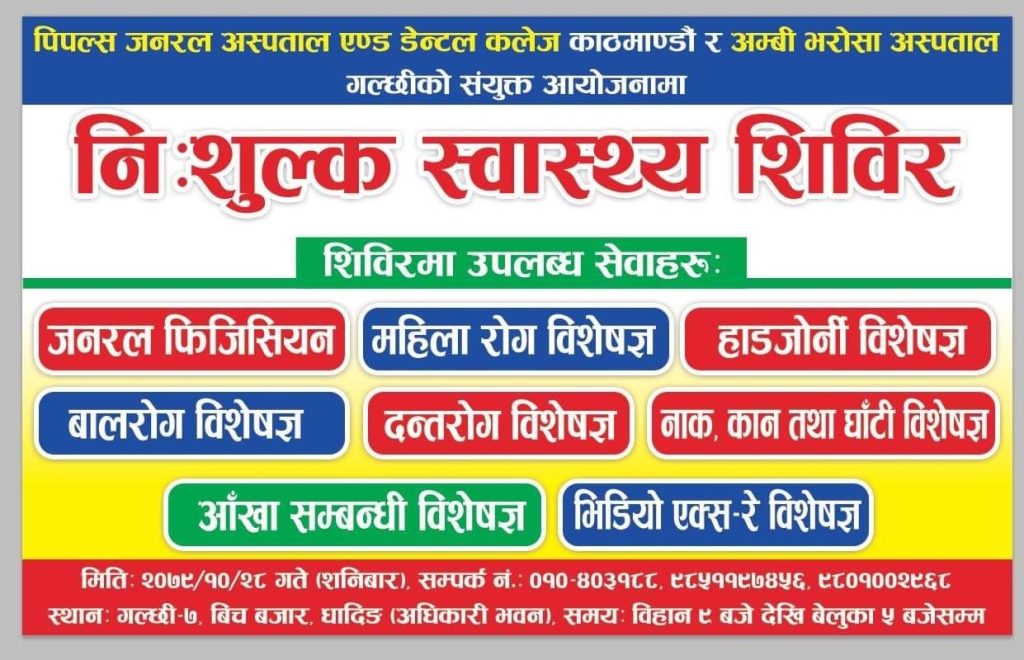 साकार पोष्ट माघ २७ गल्छी बैरेनी।गल्छी गाउॅ पालिका वडा नं ७ मा रहेको अम्बी भरोसा अस्पतालमा यही मिति २०७९ साल माघ २८ शनिवारका दिन पिपल्स जनरल अस्पताल एण्ड डेन्टल कलेज काठमान्डौ र अम्बी भरोसा अस्पतालको सयुक्त आयोजनामा नि :शुल्क स्वास्थ्य शिविर हुने भएको छ उक्त शिविरमा जनरल फिजिसियन महिला रोग विशेषज्ञ हाडजोर्नी विशेषज्ञ बालरोग विशेषज्ञ दन्त रोग विशेषज्ञ नाक कान घॉटी विशेषज्ञ आखॉ बिशेषज्ञ तथा भिडियो एक्सरे विशेषज्ञ डाक्टरहरबाट स्वास्थ्य उपचार उपलब्ध हुने जानकारी दिएको छ।