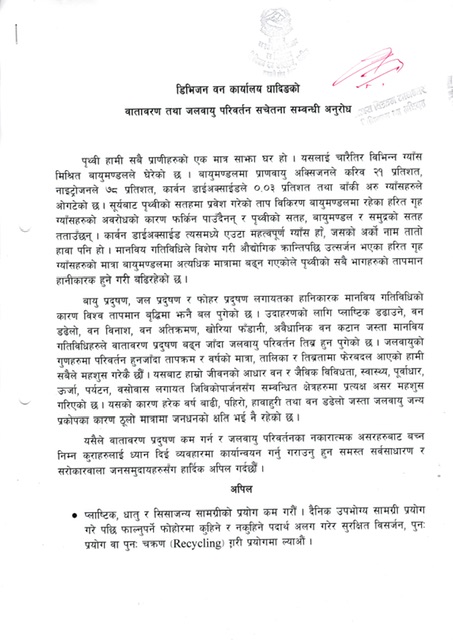 यसैले वातावरण प्रदुषण कमगर्न र जलवायु परिवर्तन कानकारात्मक असरहरुबाट बच्ननिम्न कुराहरुलाई ध्यानदिई व्यवहारमा कार्यान्वयन गर्नु गराउनुहुन समस्त सर्वसाधारण र सरोकारवाला जनसमुदायहरुसँग हार्दिक अपिलगर्दछौँ ।